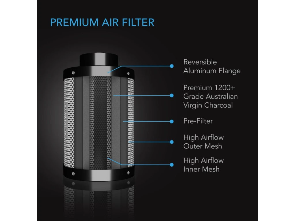 Der Aktivkohlefilter filtert zuverlässig Gerüche und Partikel aus der Luft. Perfekt für diskreten Indoor-Anbau und eine saubere Umgebung.