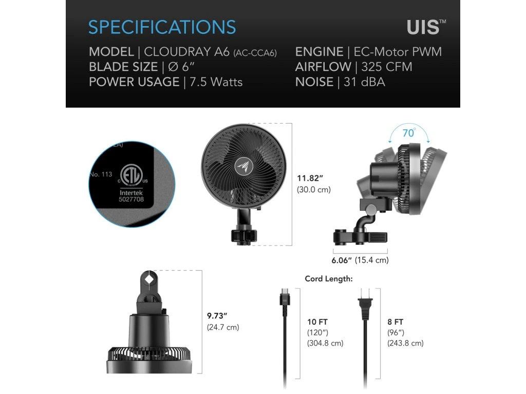 Produktinformationen "CLOUDRAY A6, Grow-Zelt-Clip-Ventilator 150mm, EC-Motor, manuell schwenkbar"