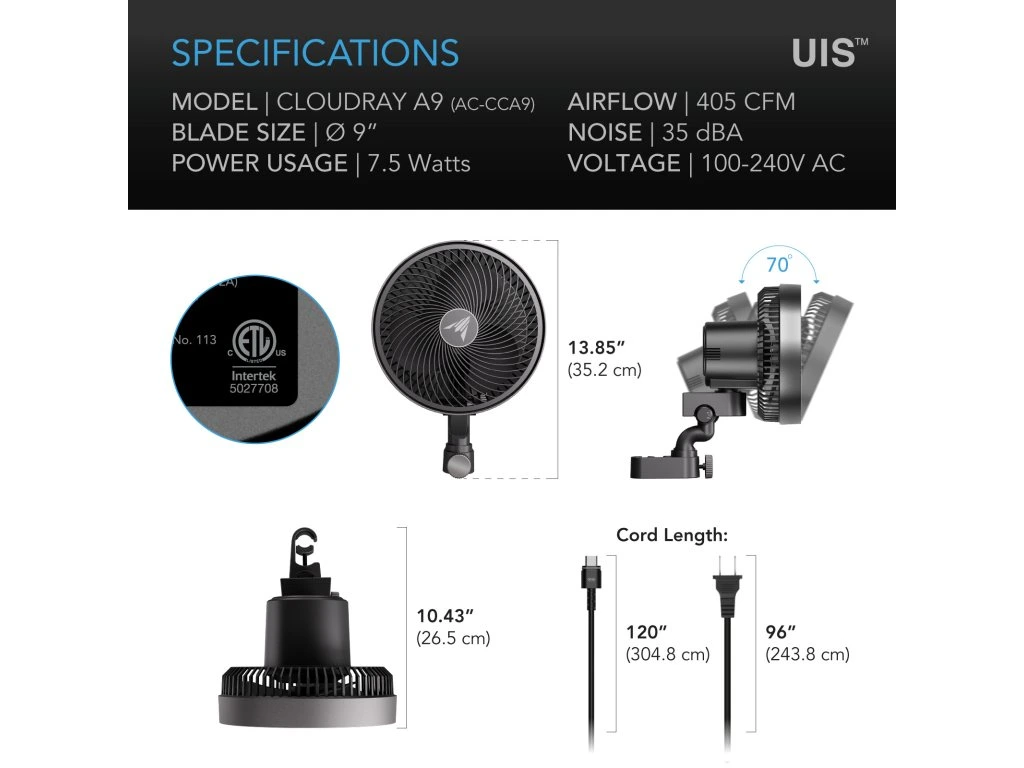 Mit einem Durchmesser von 225 mm ist der CLOUDRAY A9 ideal für größere Growzelte und Räume. Er sorgt für eine starke Luftzirkulation und stabile Bedingungen.