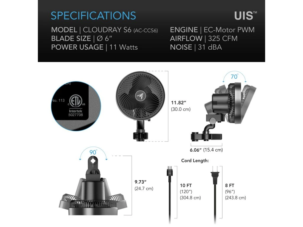 Mit einem Durchmesser von 150 mm ist der CLOUDRAY S6 ideal für Growzelte und Indoor-Anbau. Die praktische Clip-Befestigung ermöglicht eine flexible und einfache Montage.