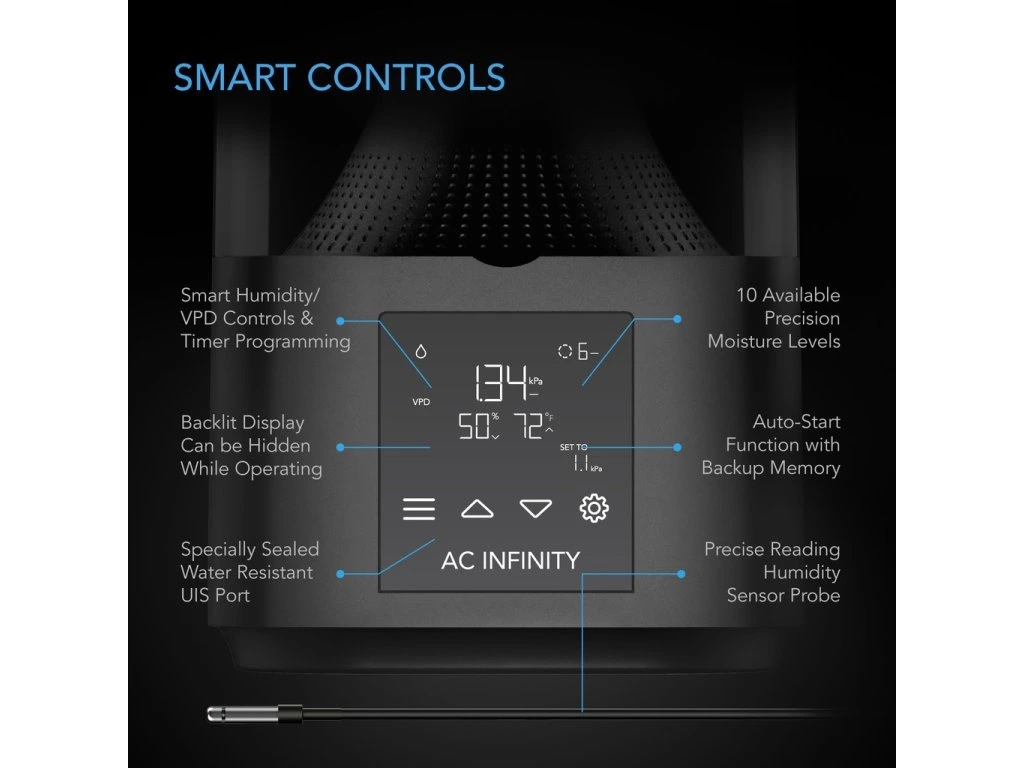 Dankzij de intelligente regeling stel je eenvoudig de gewenste luchtvochtigheid in en blijft deze stabiel. Het systeem past zich automatisch aan veranderingen aan voor een optimaal kweekklimaat.