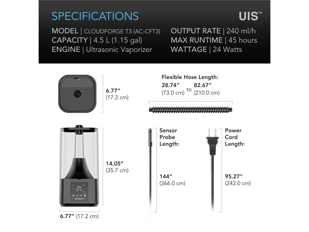 Met een ruime 4,5 liter watertank werkt de CLOUDFORGE T3 langdurig zonder bijvullen. Ideaal voor continu gebruik in kweektenten en indoor ruimtes.