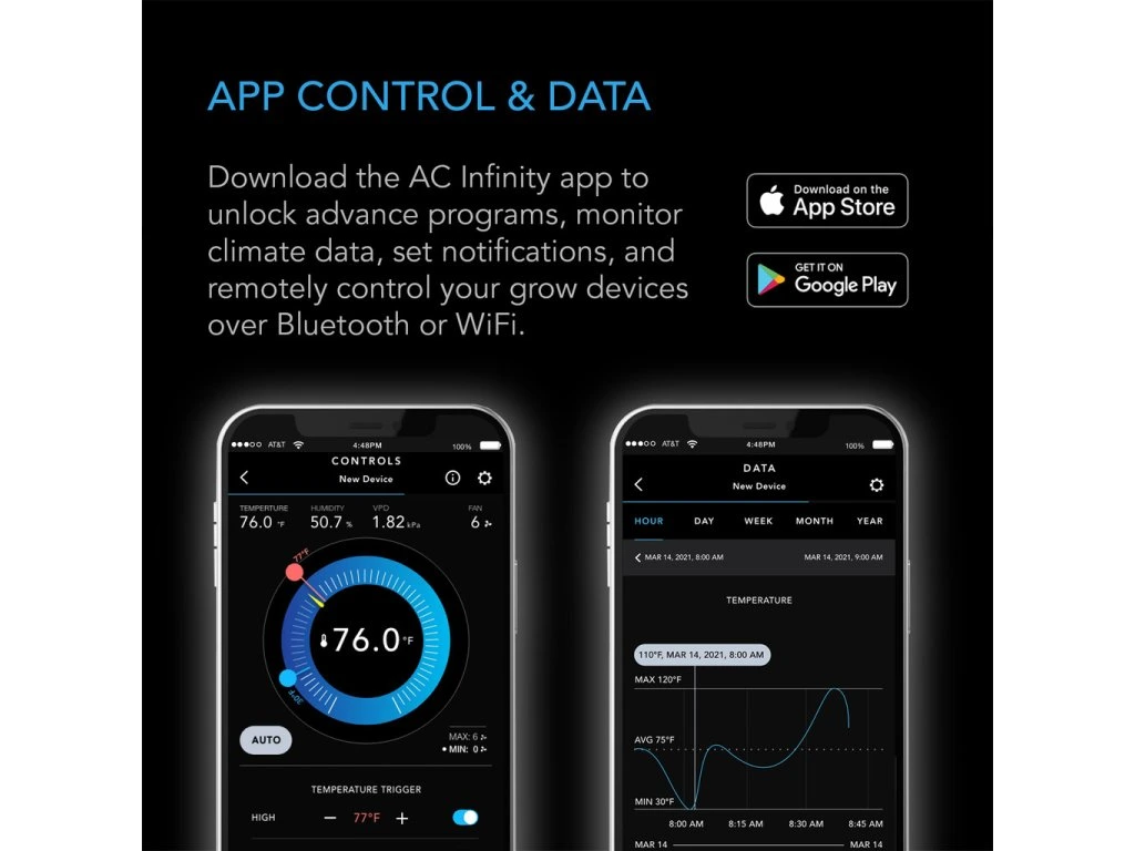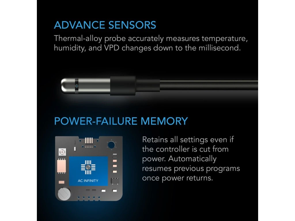 Der Controller ermöglicht die unabhängige Programmierung von bis zu vier Geräten wie Ventilatoren, Beleuchtung oder Luftbefeuchtern. So kannst du jedes Element deines Setups individuell anpassen.
